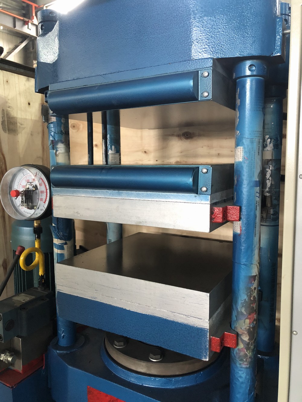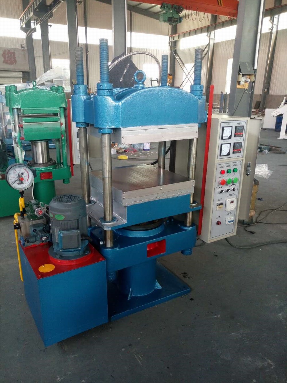 平板硫化機主要由主機、液壓系統(tǒng)、電控系統(tǒng)三大部分組成,油箱單獨安裝在主機左側(cè),不受熱板溫度的影響;操作閥安裝在主機左側(cè),工人操作方便、視覺寬敞;電控箱另行安裝于主機之右側(cè)。