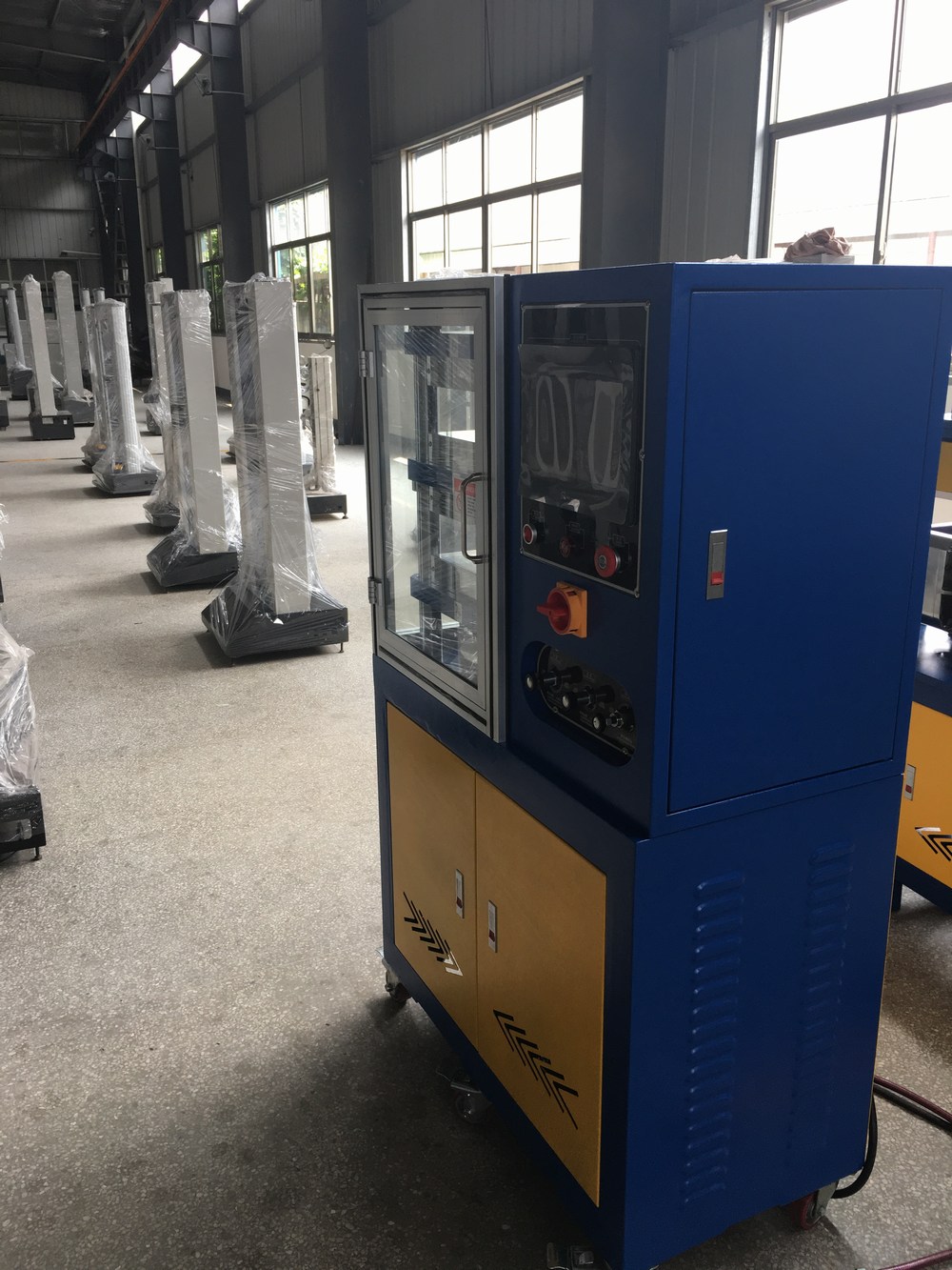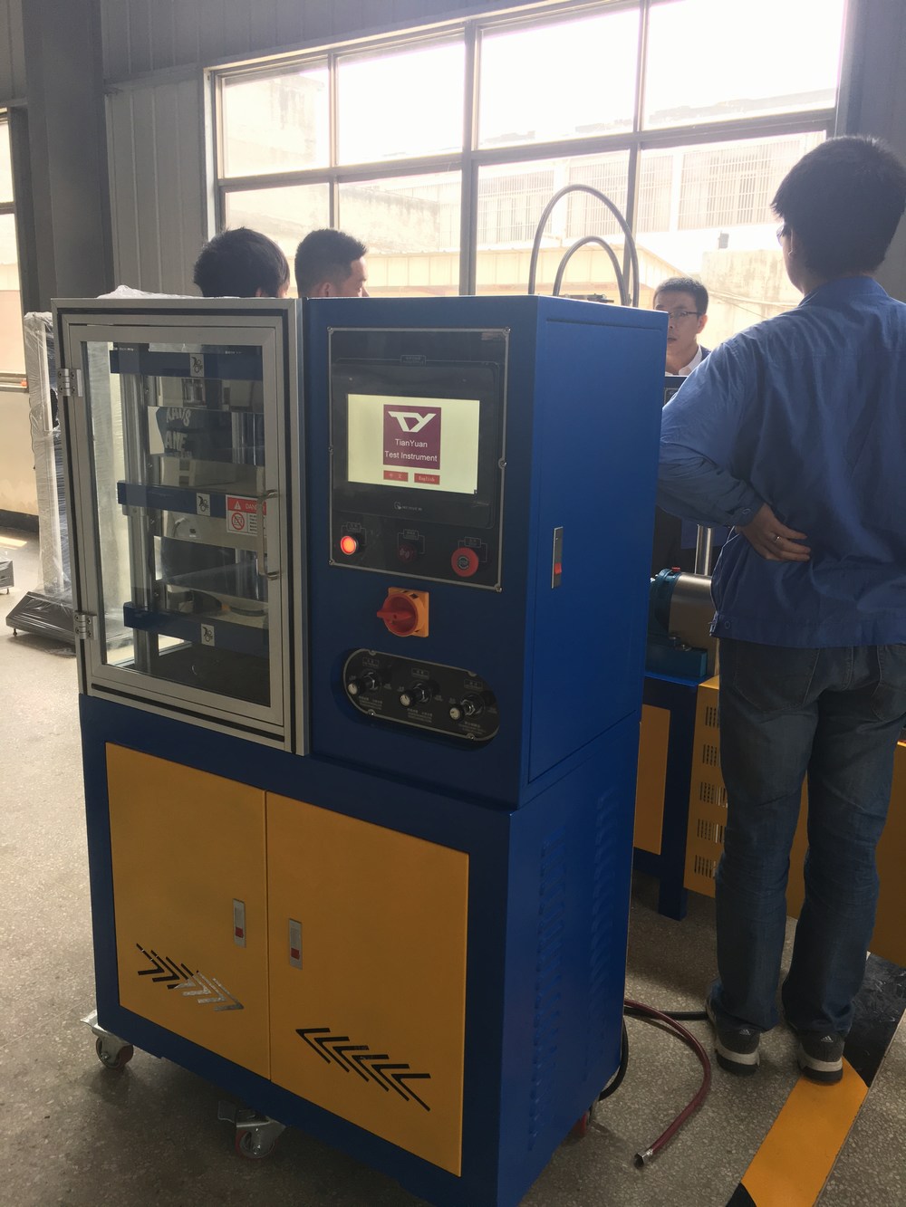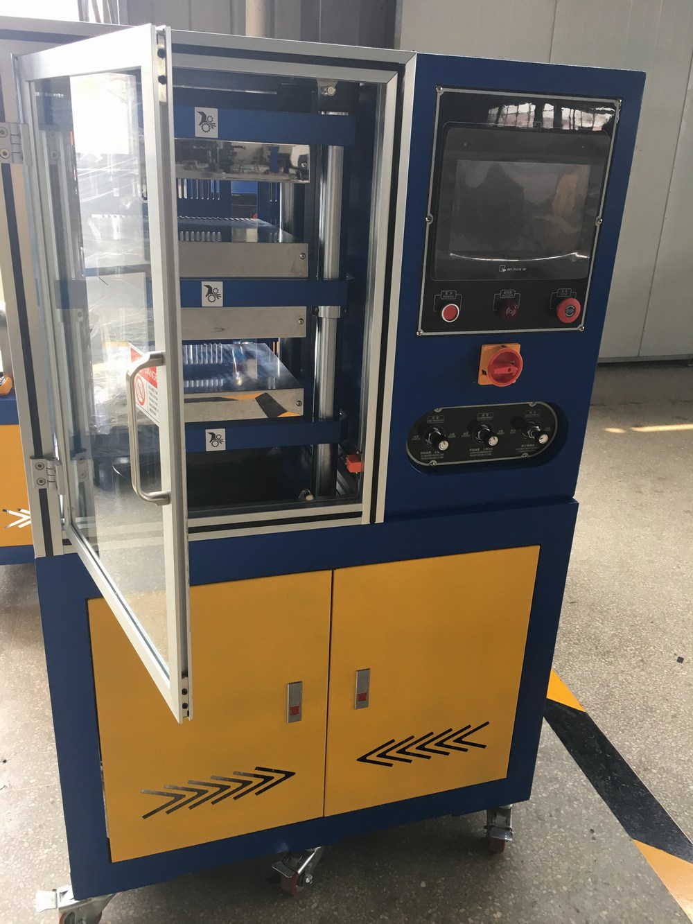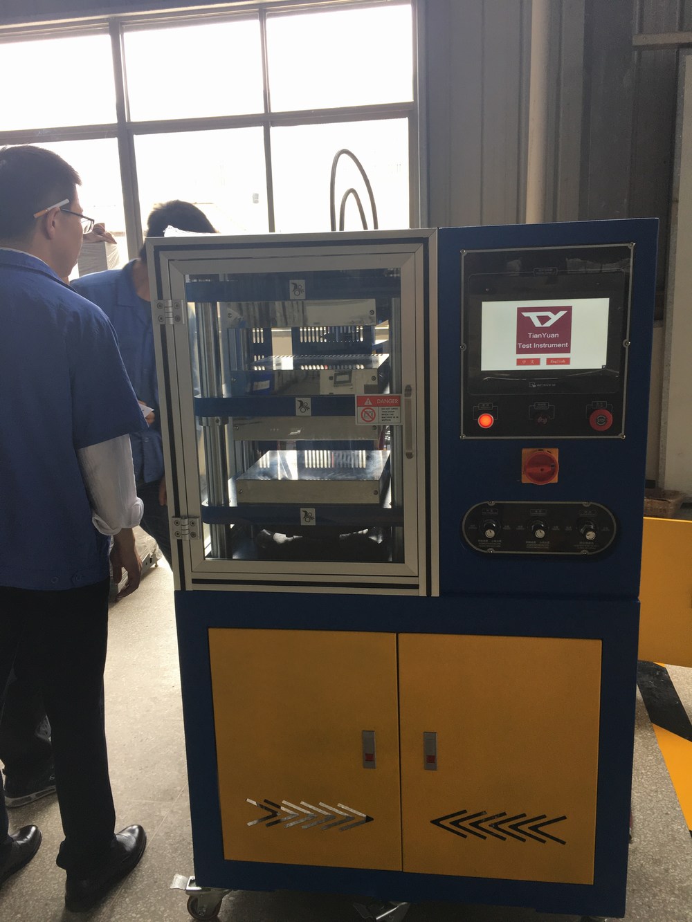 原料放于鑄模內(nèi),夾于本機(jī)電熱平板間加以壓力及溫度,使原料成型,以供試驗(yàn),做為工廠大量生產(chǎn)配料之依據(jù)。本機(jī)裝有 PLC 程序控制彩色觸摸屏,人機(jī)界面作業(yè)系統(tǒng)可設(shè)定壓力、溫度、時(shí)間和排氣次數(shù),硫化過程即時(shí)顯示和監(jiān)視,所設(shè)模壓程序全數(shù)自動完成。
